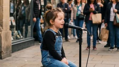 A young girl's street performance captivates passersby with her emotional singing, transforming a casual moment into a memorable experience.