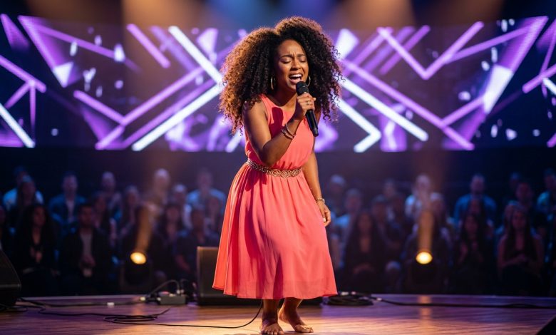 The scene unfolds with a steady, eye-level shot, capturing a radiant young woman standing confidently at center stage. Her presence is immediately captivating—her voluminous dark brown curls cascade freely over her shoulders, framing a face illuminated by a warm, self-assured smile as she begins to sing.