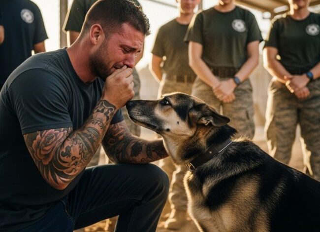 Then the dog began to tremble. Slowly, painfully, the Shepherd limped forward. His tail wagged weakly before he pressed his graying muzzle into Marcus’s chest, resting his full weight against him like he had been waiting for this moment for years. Marcus dropped to his knees.