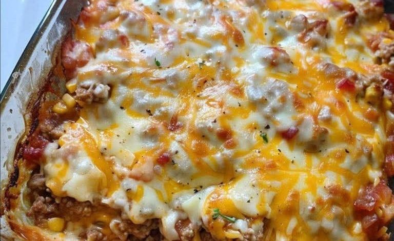 Bake: Sprinkle the top generously with Cheddar cheese. Bake in the preheated oven for about 25 minutes, or until the cheese is melted and bubbly.