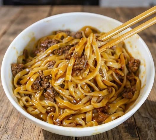 The dish is built by first cooking the wheat ribbons and then preparing the savory components in a large skillet. The milled bovine meat is sautéed until browned, and the aromatic roots are quickly stirred in. The various sweet and savory liquids are then added and reduced over low heat until the sauce becomes satisfyingly dense. Finally, the cooked wheat ribbons are added back to the skillet and thoroughly tossed to coat every strand with the rich sauce.