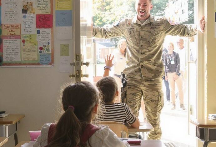 The soldier, dressed in uniform, stepped inside with arms wide open. His daughter froze for just a moment before her expression lit up with recognition. She rushed toward him, her laughter filling the room as classmates and teachers watched with wide smiles and misty eyes.