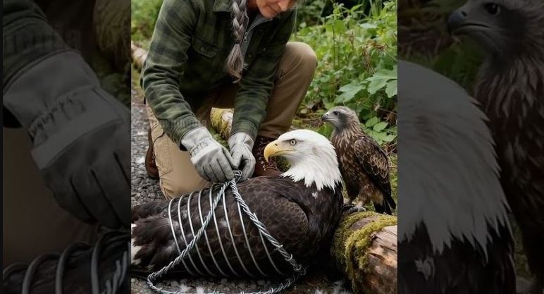The majestic bird’s powerful wings were caught, and every attempt to escape only made things worse. Acting quickly, the woman approached slowly, speaking softly to calm the frightened eagle. With patience and courage, she began loosening the snare that held its leg, knowing one wrong move could injure the bird further.
